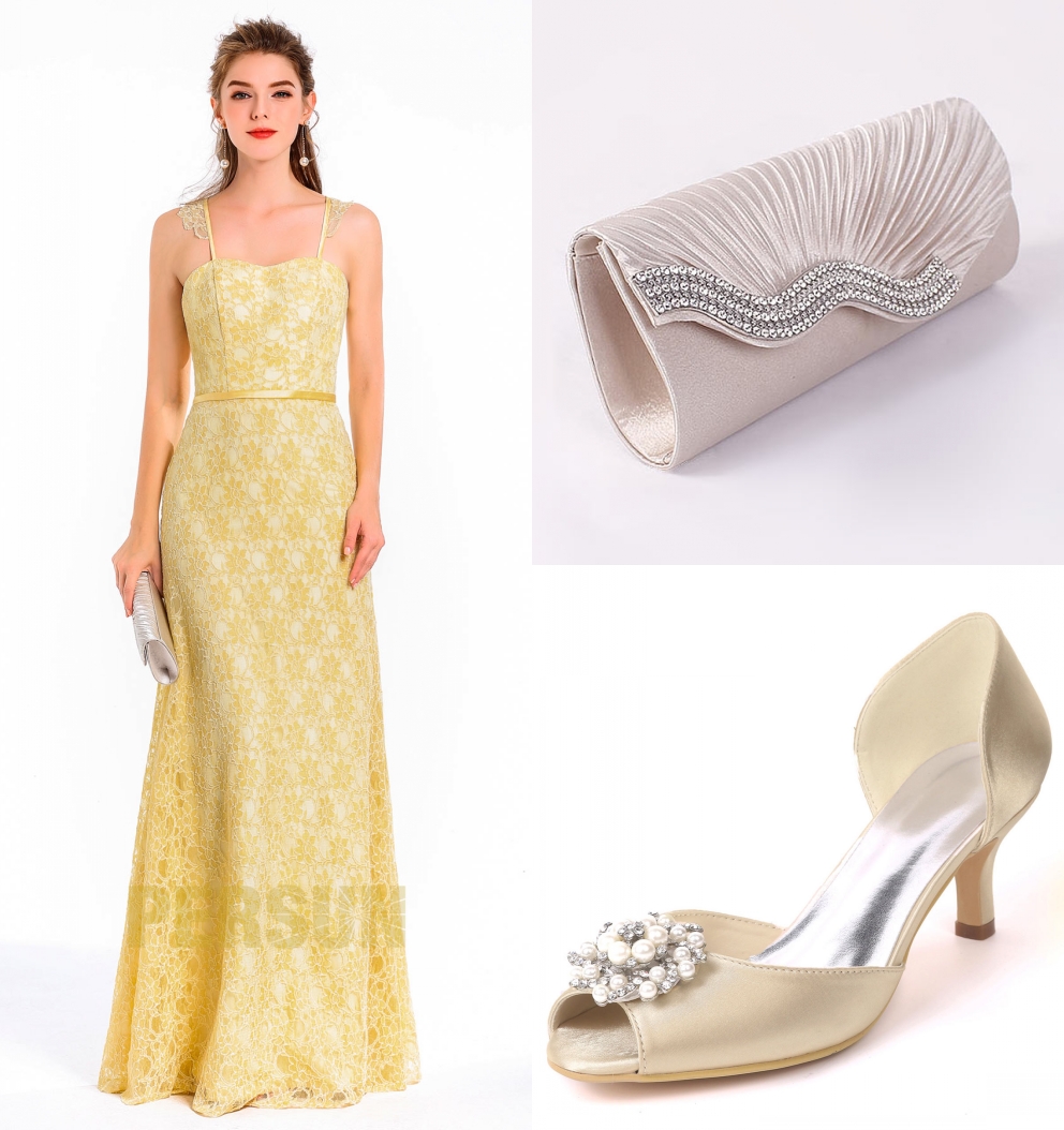 Robe de soirée longue jaune en dentelle à bretelle fine