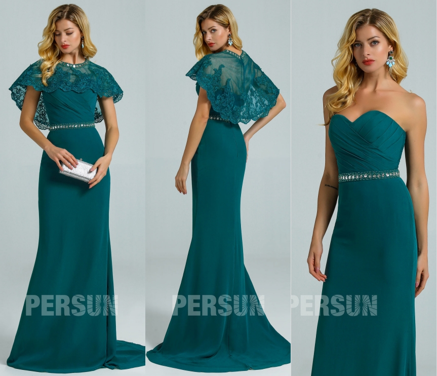 Robe de soirée 2020 sirène vert pin bustier avec cape en dentelle